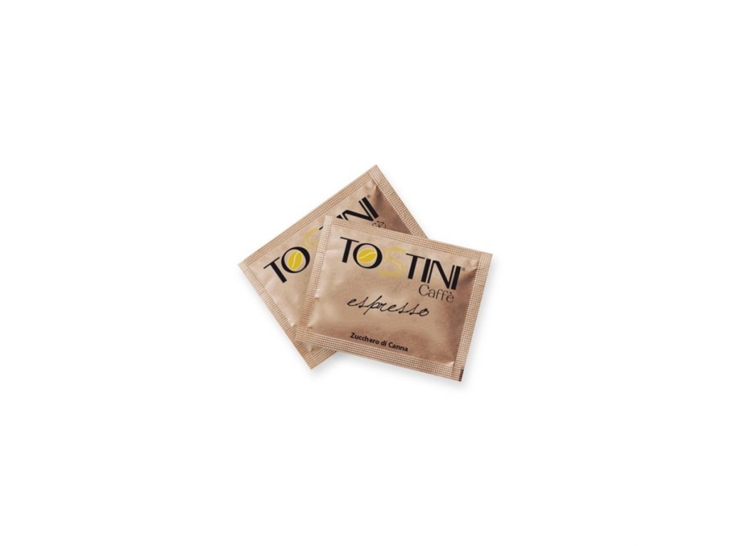 Cukr hnědý třtinový Tostini 5 kg, jednotlivě balené porce cukrů á 4 g.