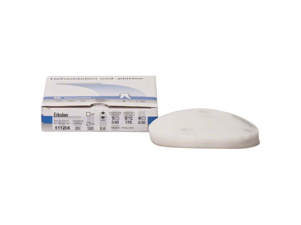 Termoplastické fólie firmy Erkodent pokrývají široké spektrum použití v dentálních laboratořích i ordinacích. Jsou zhotoveny z různých druhů materiálů v odlišných sílách pro jednotlivé aplikace. Dodávají se ve třech rozměrech: - kulaté (průměr 120 mm nebo průměr 125 mm) - čtvercové (125 mm x 125 mm)