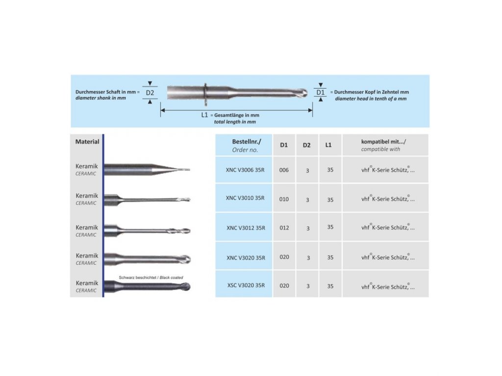 Fréza CAD/CAM, vhf + Schütz, Keramik, průměr 2mm, XNCV302035R