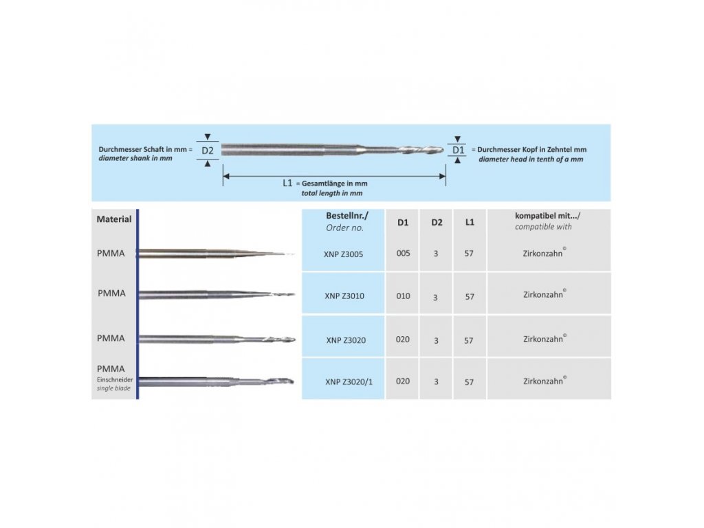 Fréza CAD/CAM, Zirkonzahn, PMMA, průměr 2mm, XNPZ3020