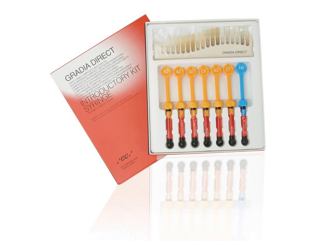 Pomocí mikrofilního hybridního kompozitního materiálu GC GRADIA DIRECT můžete konečně velmi snadným způsobem zhotovit esteticky nejnáročnější restaurace zubů. Použití GC Gradia Direct usnadňuje a urychluje zhotovení skvělé a přirozeně působící trvanlivé výplně v jedno i vícevrstvé technice. Díky množství a kvalitě barev lze dosáhnout výborných výsledků v jedné vrstvě. Kombinace různých barev umožňuje dosažení vynikajících estetických výsledků, při použití maximálně tří barev ve frontálním nebo dvou barev v distálním úseku. Intro Kit 6x stříkačky pro frontální úsek – A2, A3, A3.5, AO3, CV, CT, 1x stříkačka pro zadní úsek P-A2, 1 vzorník odstínů.