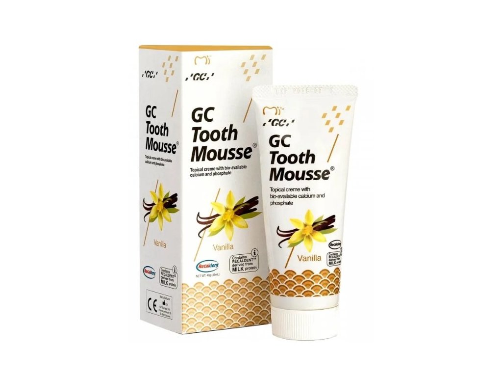 Bioaktivní dentální krém na bázi vody, bez cukru a s obsahem Recaldentu CPP-ACP. GC Tooth Mousse aktivně pomáhá obnovit minerální rovnováhu v ústní dutině. Dodává vysokou koncentraci vápníku a fosfátu na potřebná místa. Poskytuje ochranu zubů, pomáhá neutralizovat kyseliny acidogenních bakterií obsažených v plaku a dalších vnitřních a vnějších zdrojích kyselin. Obnovuje minerální rovnováhu u pacientů se salivačními vadami, dále po procedurách jako je bělení zubů, vyhlazení kořene a kyretážích. Přispívá ke snížení přecitlivělosti dentinu. Skvěle chutná a dělá zuby hladší a čistější. Balení 35 ml.