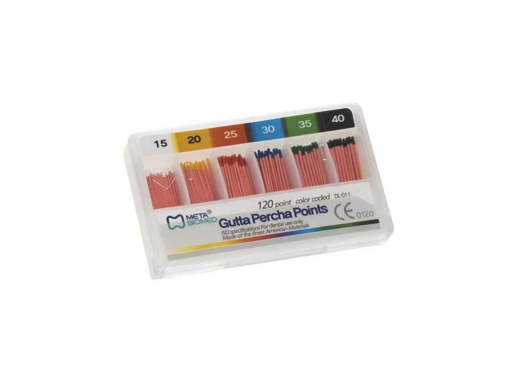 Velmi stabilní, pružné a přesto nelámavé guttaperčové čepy. Rentgenkontrastní. Kónicita 2%. Balení 120 ks.