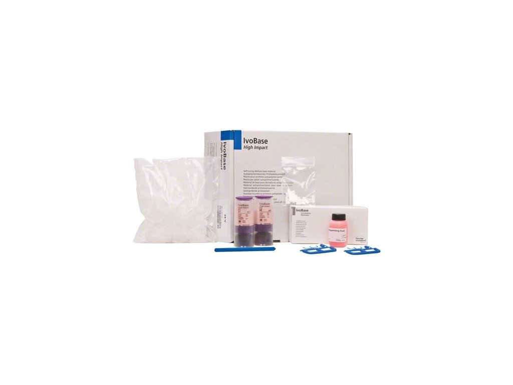 IvoBase High Impact kombinuje kvalitativní výhody teplem tuhnoucích polymerů s vlastnostmi při zpracování samo-tuhnoucích polymerů a tvoří tak novou kategorii pryskyřic na baze snímatelných náhrad. Materiál na bázi PMMA se zpracovává v injektoru IvoBase Injector. Odpovídá normě EN ISO 20795-1. Výhody: - Materiál velmi odolný vůči nárazu a zlomení - Vysoká přesnost dosednutí díky kompenzaci smršťování - Velmi nízký obsah zbytkového monomeru < 1% díky redukci zbytkového monomeru (RMR) - Vynikající vazebné vlastnosti s pryskyřičnými zuby - Vysoký základní lesk - Předem nadávkované kapsle - Délka polymerace: 50 minut