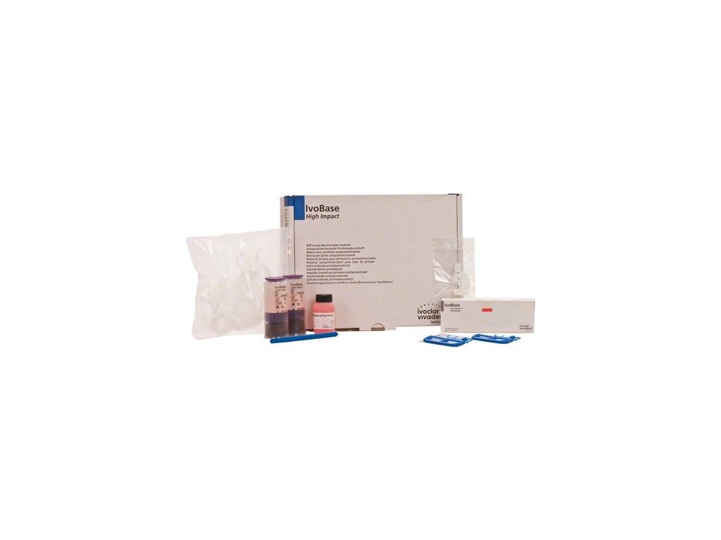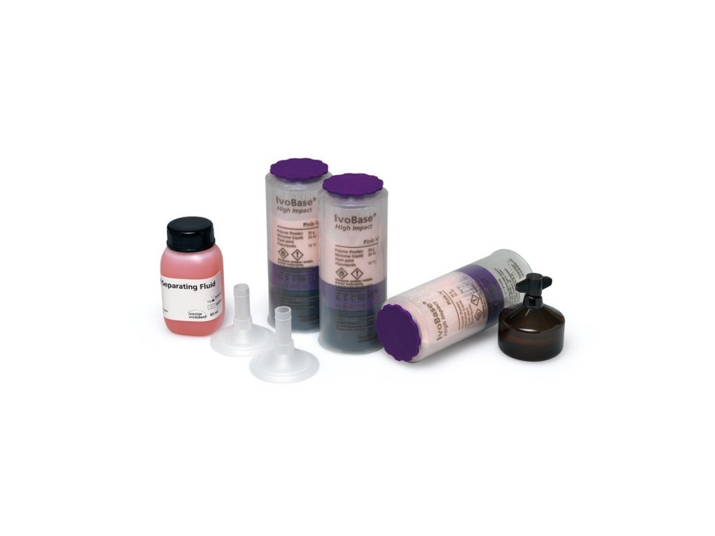 IvoBase High Impact kombinuje kvalitativní výhody teplem tuhnoucích polymerů s vlastnostmi při zpracování samo-tuhnoucích polymerů a tvoří tak novou kategorii pryskyřic na baze snímatelných náhrad. Materiál na bázi PMMA se zpracovává v injektoru IvoBase Injector. Odpovídá normě EN ISO 20795-1. Výhody: - Materiál velmi odolný vůči nárazu a zlomení - Vysoká přesnost dosednutí díky kompenzaci smršťování - Velmi nízký obsah zbytkového monomeru < 1% díky redukci zbytkového monomeru (RMR) - Vynikající vazebné vlastnosti s pryskyřičnými zuby - Vysoký základní lesk - Předem nadávkované kapsle - Délka polymerace: 50 minut