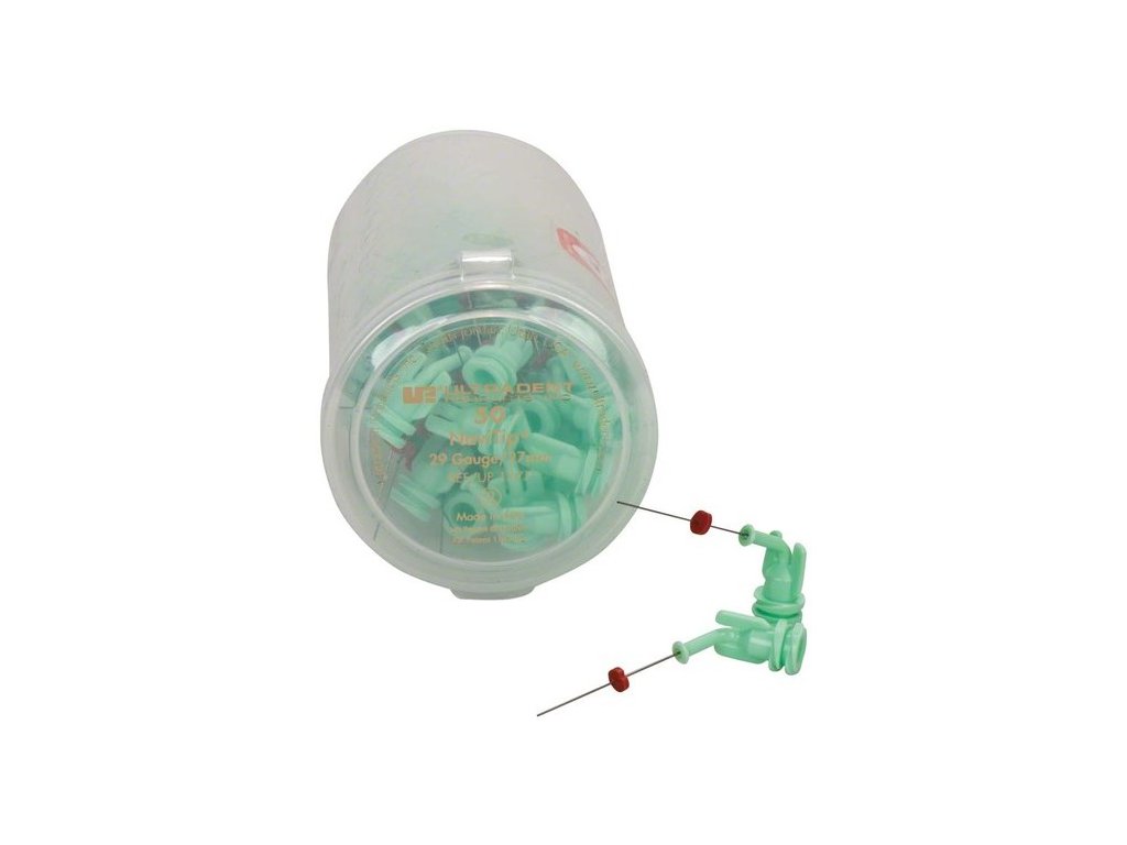 Ohebné kanyly z nerez oceli pro snadnou manipulaci v zakřivených kanálcích. Dva typy: 29 ga pro pastové materiály, 30 ga pro roztoky a gely. Balení 50 ks, průměr 0,33 mm.