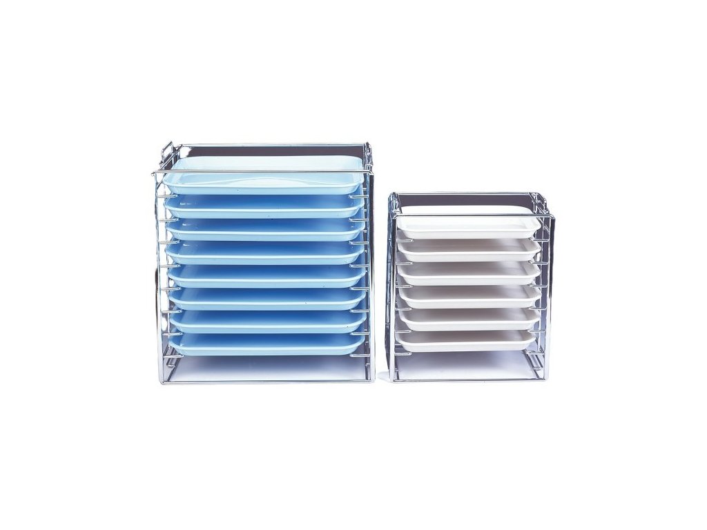 Stojan na traye z odolné chromové ocelové konstrukce. Mini - 6 zásobníků. Šířka 28 cm x hloubka 17 cm x výška 29 cm.