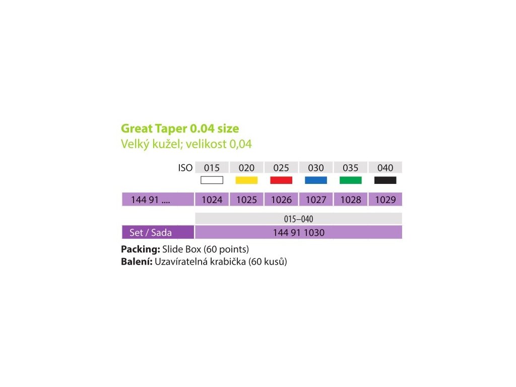 Tyto maximálně tvarově a rozměrově přesné čepy jsou vyrobeny z přírodní gutta perchové gumy nejvyšší kvality. Jsou ideální pro vyplnění kořenových kanálků opracovaných nástroji Navigator EVO a Unicone. Výhody: - Vyrobené z přírodní gutta perchové gumy nejvyšší kvality - Tvarově i rozměrově maximálně přesné - Ideální poměr pevnosti použité gumy a zpracivatelnosti čepu - Dlouhá doba skladovatelnosti - Sterilní provedení Balení 60 ks, 4% konicita.