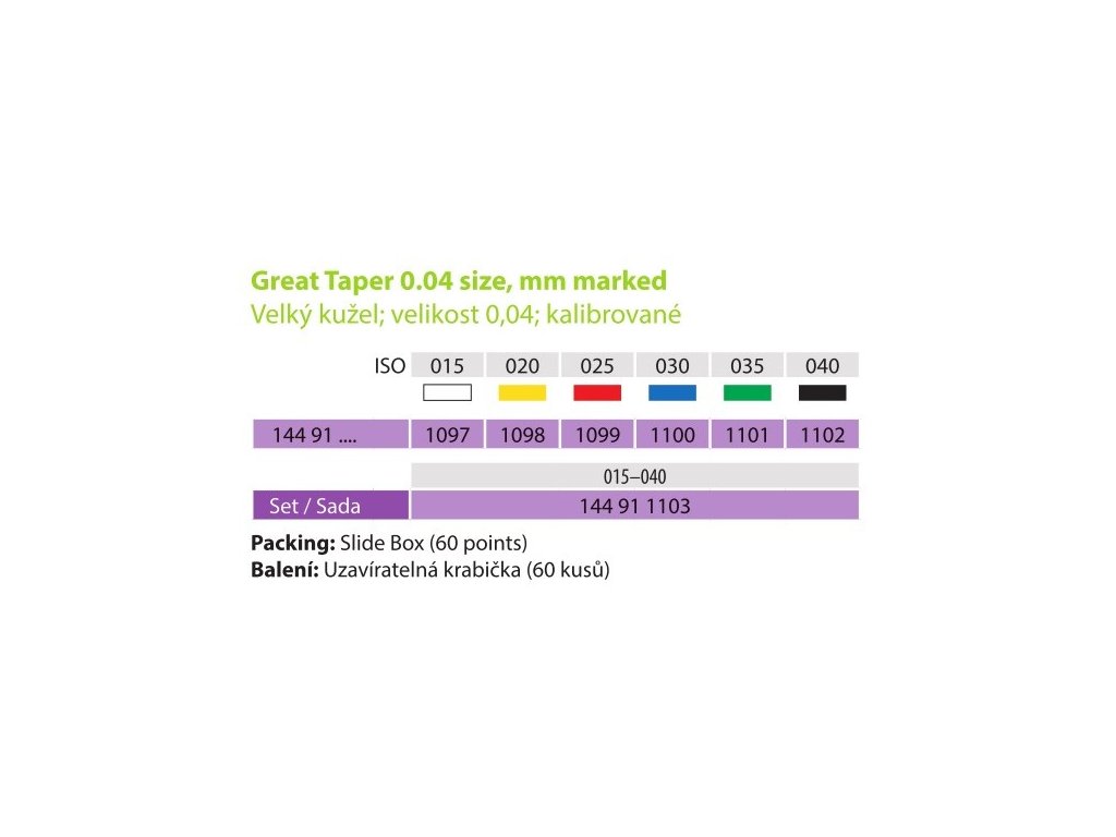 Čepy gutta percha kužel 0.04 set 015-040; kalibrované