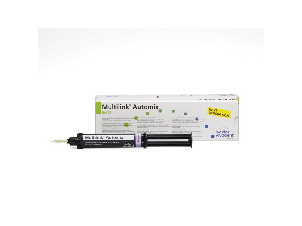 Multilink Automix je adhezivní upevňovací systém na cementování nepřímých náhrad vyrobených z křemičité a oxidové keramiky (např. IPS e.max), z kovu a metalokeramiky, i z kompozit. Výhody: - Pevně drží: duálně i samo-tuhnoucí - Univerzální: váže se na křemičitou a oxidovou keramiku i kovy - Úspěšný a ověřený v celé řadě dlouhodobých klinických studií - Optimální odstraňování přebytečného materiálu - Optimální kvalita okrajů Balení 9 g Multilink Automix, příslušenství.