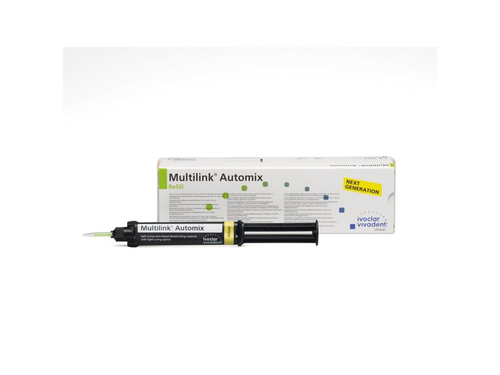 Multilink Automix je adhezivní upevňovací systém na cementování nepřímých náhrad vyrobených z křemičité a oxidové keramiky (např. IPS e.max), z kovu a metalokeramiky, i z kompozit. Výhody: - Pevně drží: duálně i samo-tuhnoucí - Univerzální: váže se na křemičitou a oxidovou keramiku i kovy - Úspěšný a ověřený v celé řadě dlouhodobých klinických studií - Optimální odstraňování přebytečného materiálu - Optimální kvalita okrajů Balení 9 g Multilink Automix, příšlušenství.