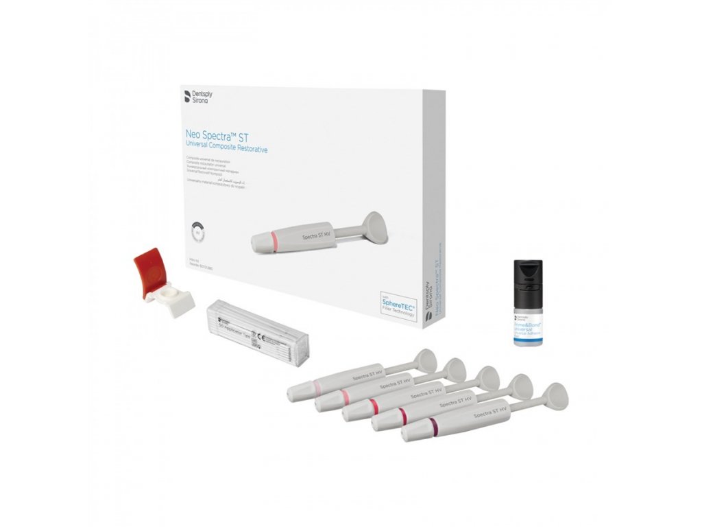 Nanokeramický světlem tuhnoucí radioopákní univerzální kompozitní materiál založený na technologii granulovaných plniv SphereTEC. Indikace: přímé výplně kavit všech tříd ve frontálním a distálním úseku, nepřímé zhotovení inlejí, onlejí a fazet. HV (High Viscosity - vysoká viskozita) LV (Low Viscosity - nízká viskozita) Neo Spectra ST úvodní balení - stříkačky (HV) 5x stříkačka HV (každá 3 g) (obsahuje odstíny: A1; A2; A3; A3.5; A4) 1x nálepka se vzorníkem odstínů I-shade 1x Prime&Bond Universal™ (2,5 ml) příslušenství