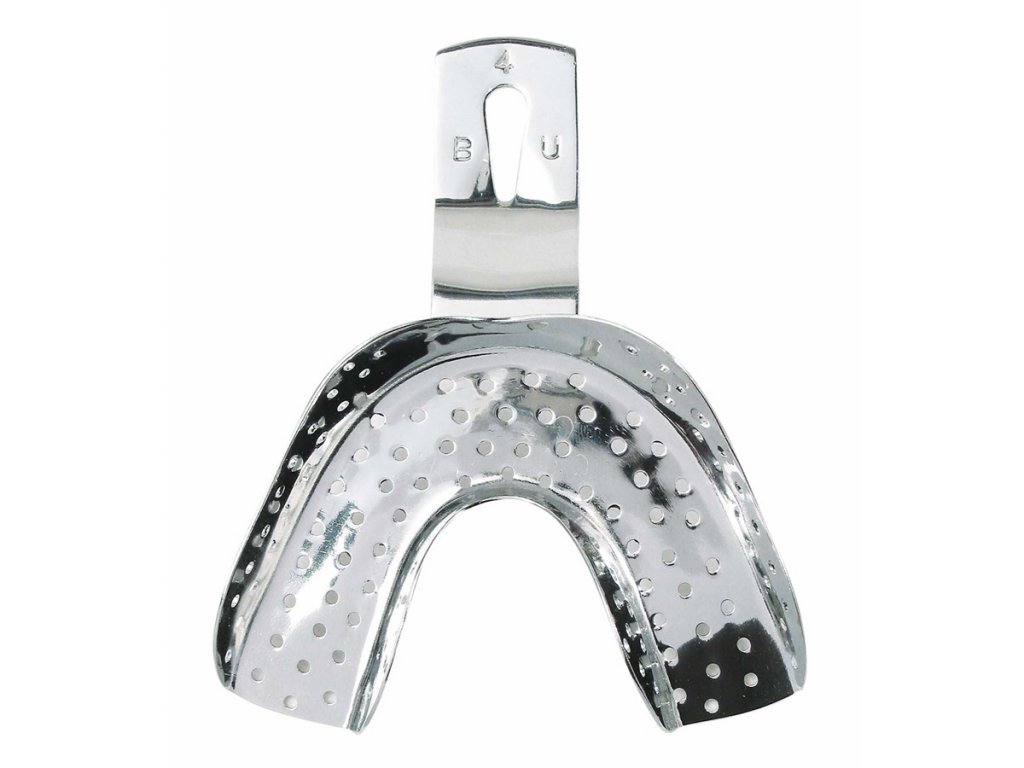 5 velikostí pro horní čelist (BO 0 - 4) a 5 velikostí pro dolní čelist (BU 0 - 4) vyrobené z kvalitní nerezové oceli. Perforované pro perfektní adhezi otiskovacích hmot, zaoblený tvar pro atraumatické otiskování. Elektropolitura zajišťuje odolnost proti korozi. Určeny pro autoklávování, termodesinfekci, čištění v ultrazvukových čističkách. Dolní čelist ozubená. Velikost 4 - BU/4.