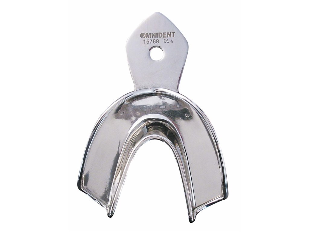 OMNIDENT otiskovací lžíce poskytují odpovídající retenci díky speciálnímu okraji bez nutnosti používat adhezivum. Materiál 18/8 ocel. Dolní čelist ozubená. Velikost 3 - UK L/2.