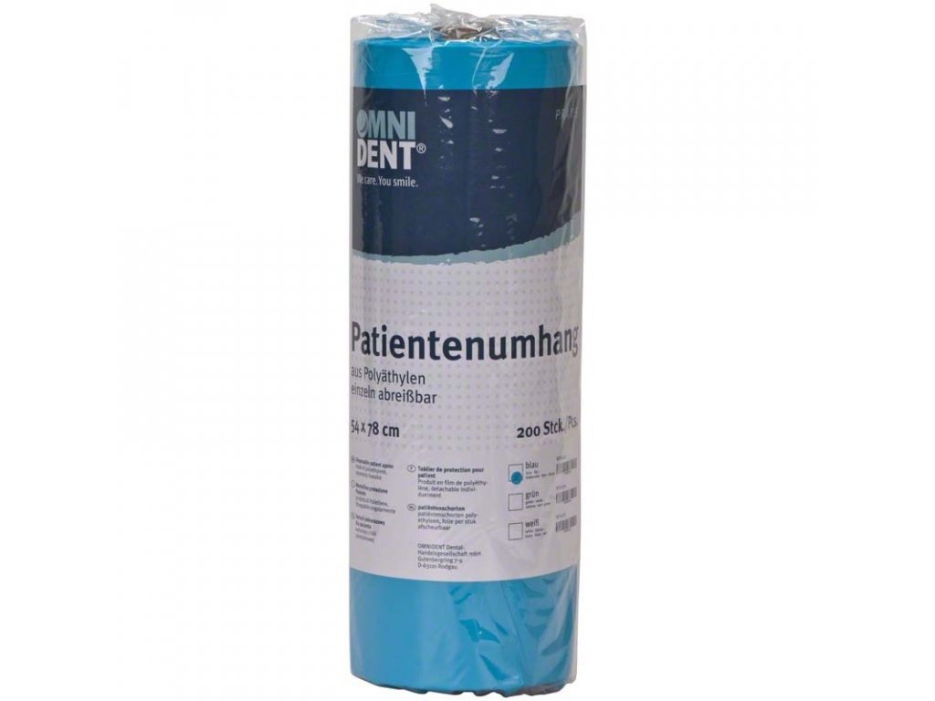 Jednorázové zástěry pro pacienta z PE-folie s vybráním na krk a páskami pro uchycení. Rozměry 54 x 78 cm. Role 200 ks.
