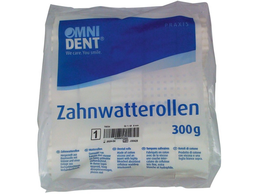 Jednorázové nesterilní vatové válečky z čisté bavlněné vaty a z vysoce bělené obvazové buničiny. Navinuty v tenkých vstvách, s vysokou sací schopností, nepouští vlákna. Balení 300 g, velikost 1, průměr 8 mm.