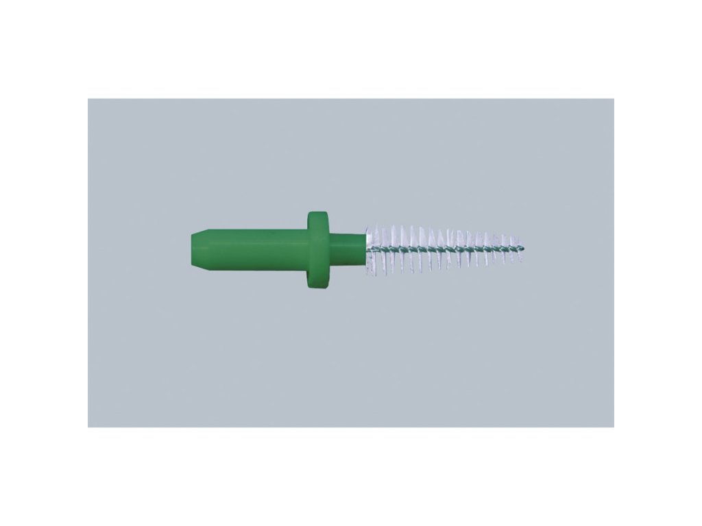 Víceúčelové mezizubní kartáčky v 10 různých provedeních pro použití v držáku. Umělohmotný barevně kódovaný dřík (probarvený). Zelené kónické, jemné, průchodnost 1,40 mm, průměr štětin 2,30 - 4,30 mm. Balení 6 ks.