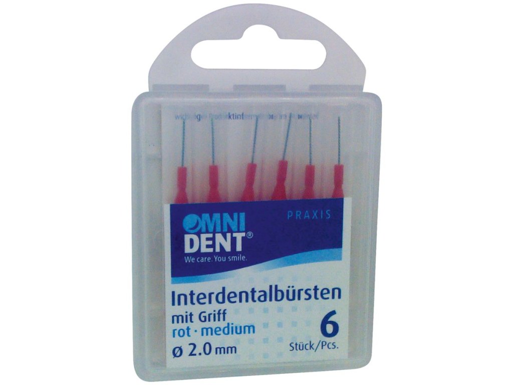 Mezizubní kartáčky s rukojetí (plastem potažené drátky) jsou velmi praktické a příjemné pro uživatele, hodí se výborně pro pacienty s rovnátky a implantáty. Červené, medium, průchodnost 0,60 mm, průměr štětin 2,00 mm. Mezizubní kartáčky s rukojetí jsou dodávané po 6 kusech.