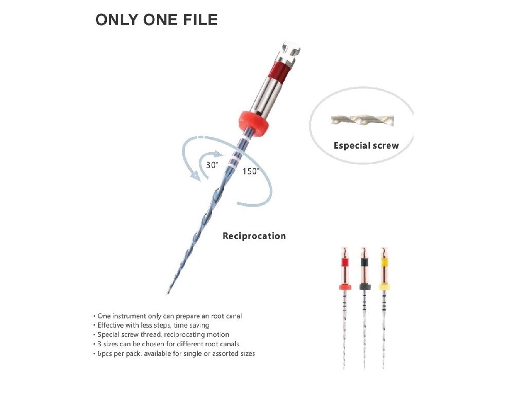 NiTi reciproprokační kořenové nástroje na strojní opracování kanálku. 2 až 3 x odolnější proti cyklické únavě než konkurenční nástroje a o 30% flexibilnější. Barevné označení: R25 = červené, R40 = černé, R50 = žluté Balení 6 ks.