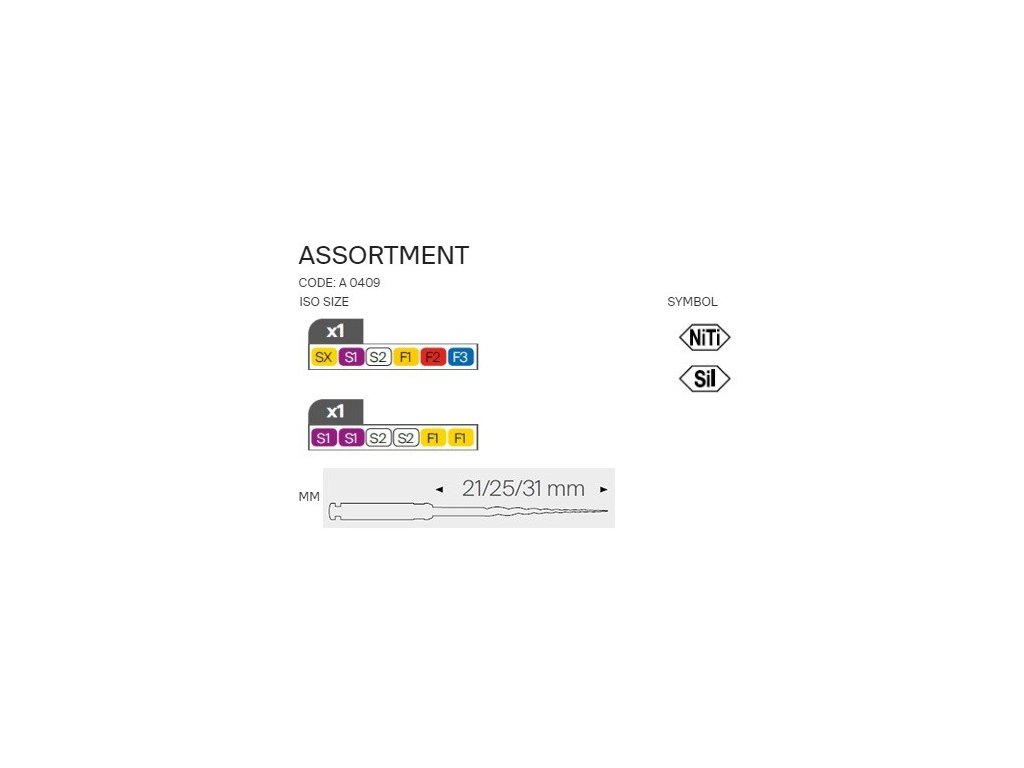 Nikl-titanové nástroje pro strojové opracování kořenových kanálků. Sortiment, délka 21 mm.
