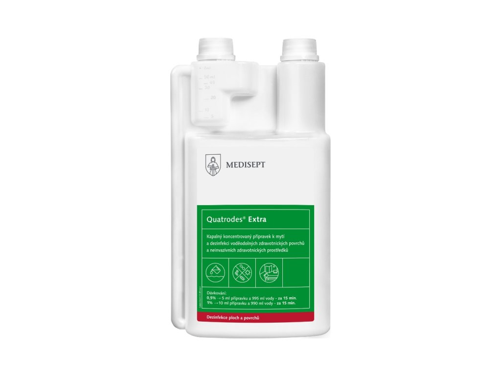 Quatrodes Extra je kapalný koncentrovaný přípravek s obsahem enzymu a nanomicelární technologií k účinné dezinfekci a čištění povrchů všech omyvatelných ploch, předmětů ve zdravotnictví, komunální a sociální oblasti.
