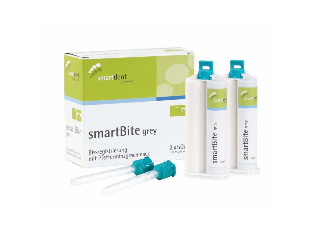 SmartBite grey materiál pro registraci skusu s mátovou příchutí. Doba tuhnut 1 - 1,3 min. Tvrdost D43. Balení kartuše 2 x 50 ml + 12 mísících kanyl.